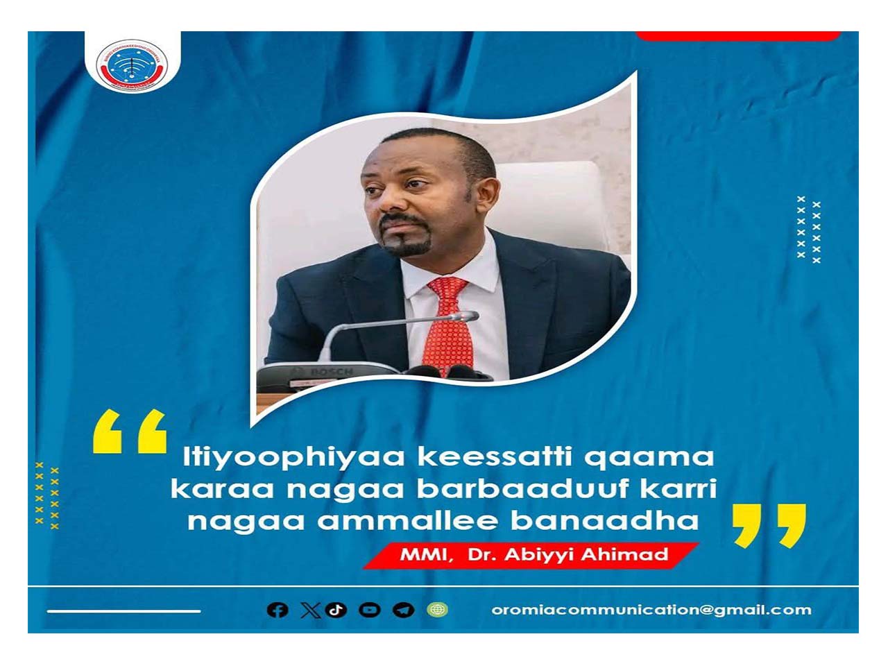 Kabajamtoota uummata naannoo keenyaa irra deebi'uun baga guyyaa Saboota, Sablammootaafi Uummattoota Itoophiyaa geessan jechaa harka tokkoon hojiilee misoomaa cimsuun karoora xiiqii qabanne milkeessuuf hojjechuun barbaachisaadha. Harka biraatiin ammoo caasaalee nageenyaa waliin ta'uun nageenya keenya tikfachaa daandii badhaadhinaa eegalle irraa osoo boodatti hin deebi'iin milkaa'inaaf akka imallu waamichan dhiyeessa. Egereen keenya aarsaa har'a kaffalluun milkaa'a. "Heddumminniifi walqixxummaan keenyas haala kanaan galma ga'ee tokkummaa biyyaalessaa waan cimsuuf hunduu gumaacha isarraa eegamu taasisuu qaba.